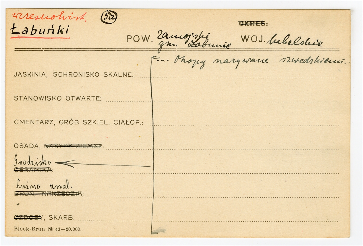 Karta stanowiska "Łabuńki gm. Łabunie pow. Zamojski woj. lubelski" (druk rękopis) - strona 1