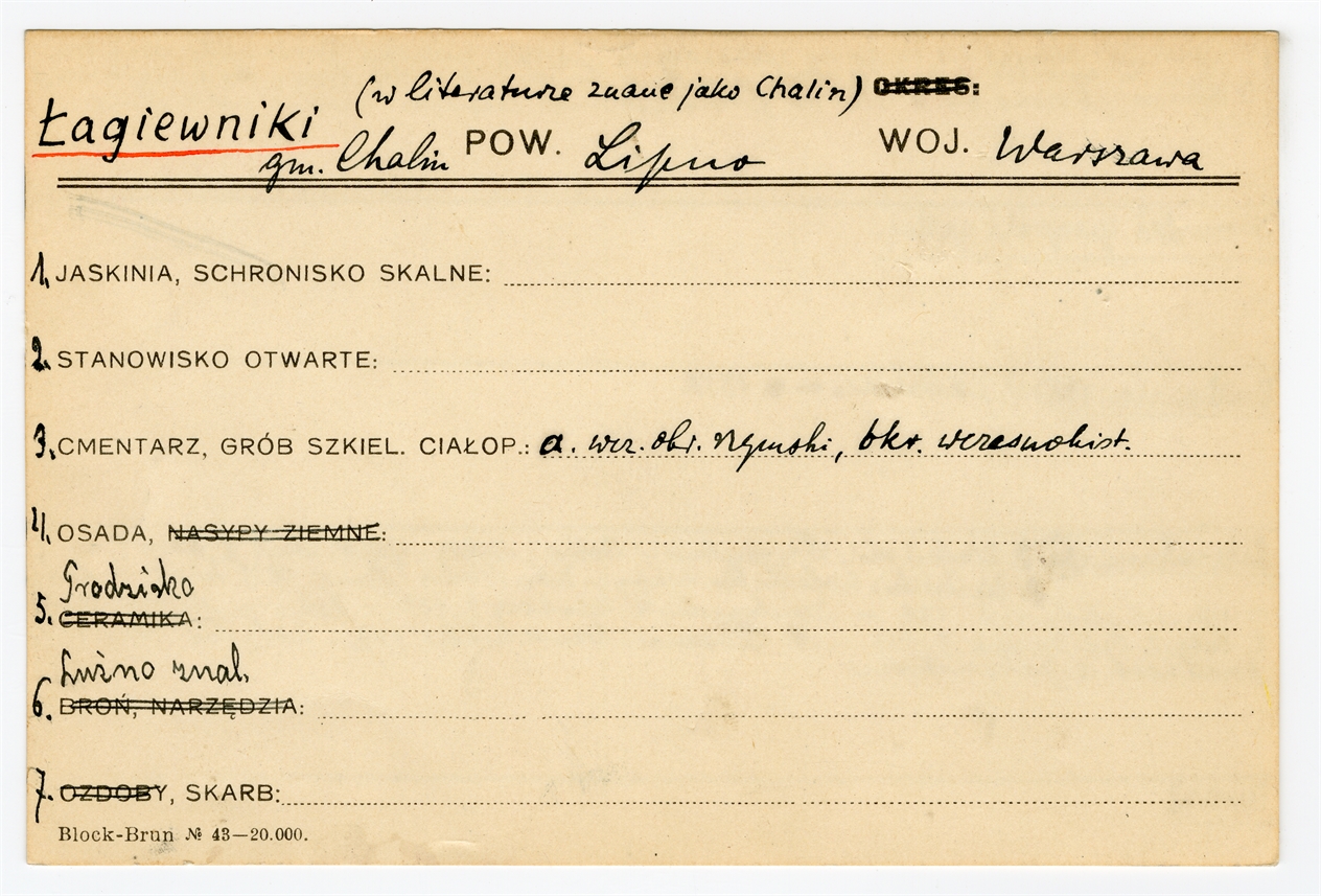 Karta stanowiska "Łagiewniki gm. Chalin pow. Lipno woj. Warszawa" (druk rękopis) - strona 1
