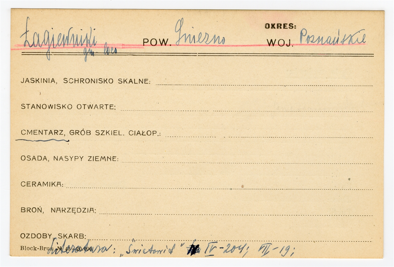 Karta stanowiska "Łagiewniki gm. loco pow. Gniezno woj. Poznańskie" (druk rękopis) - strona 1