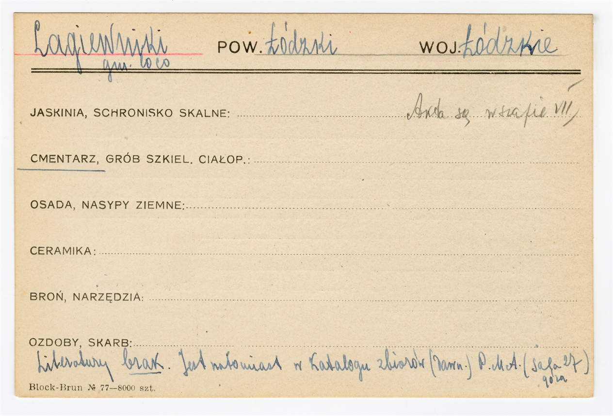 Karta stanowiska "Łagiewniki gm. loco pow. Łódzki woj. Łódzkie" (druk rękopis) - strona 1