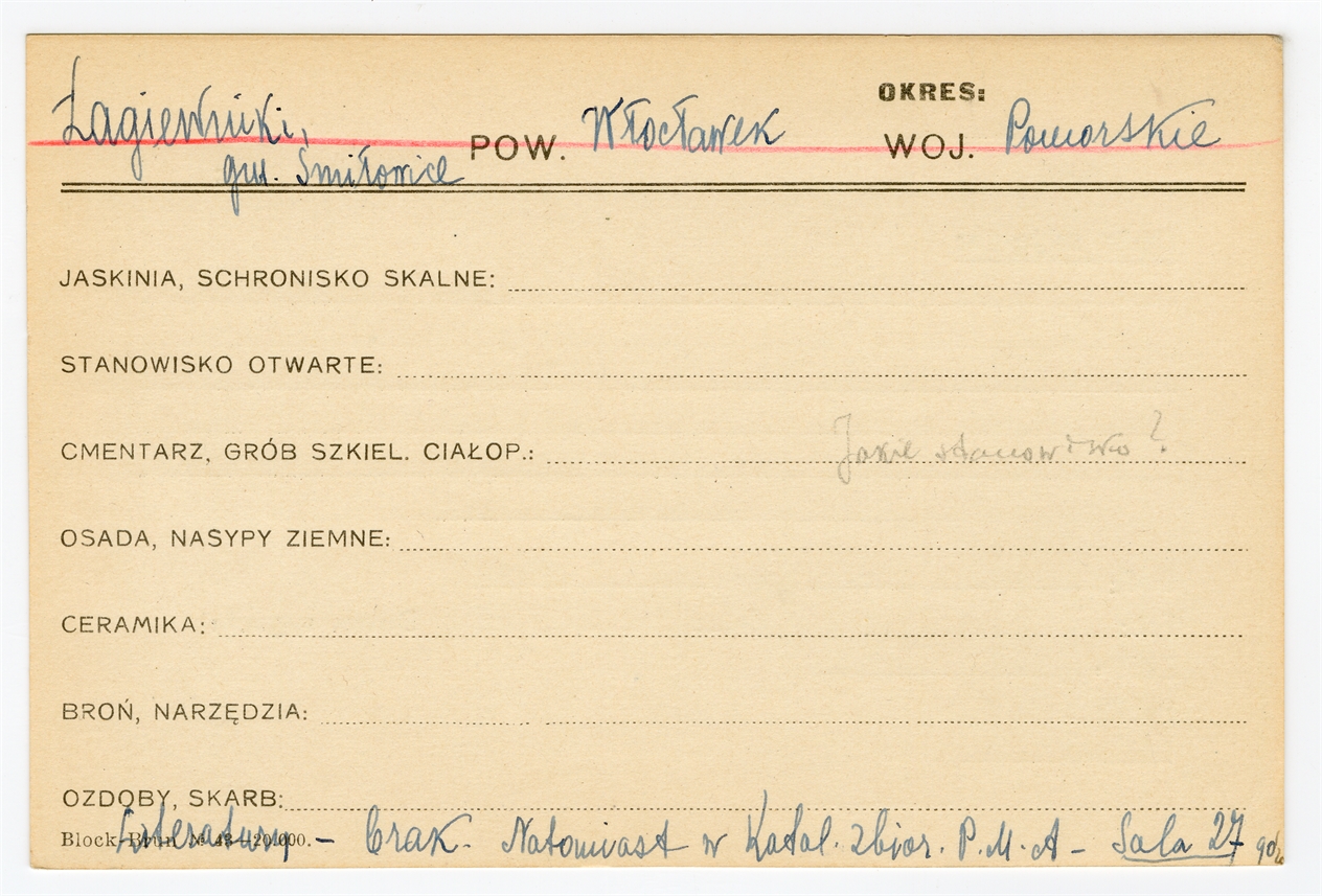 Karta stanowiska "Łagiewniki gm. Śmiłowice pow. Włocławek woj. Pomorskie" (druk rękopis) - strona 1