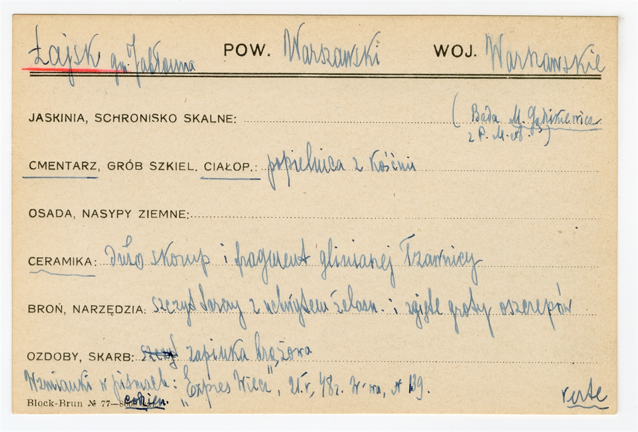 Karta stanowiska "Łajsk gm. Jabłonna pow. Warszawski woj. Warszawskie" (druk rękopis) - strona 1