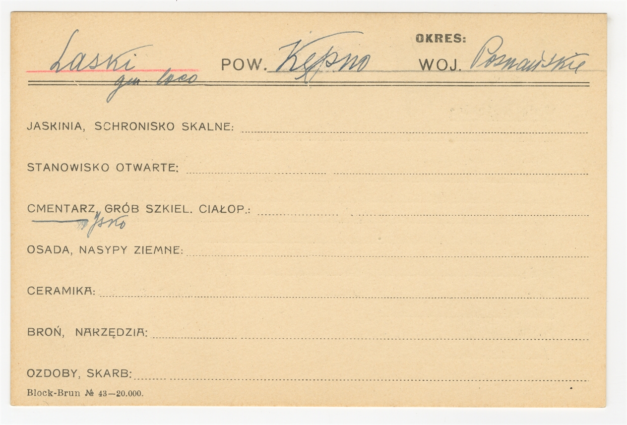 Karta stanowiska "Laski gm. loco pow. Kępno woj. Poznańskie" (druk rękopis) - strona 1
