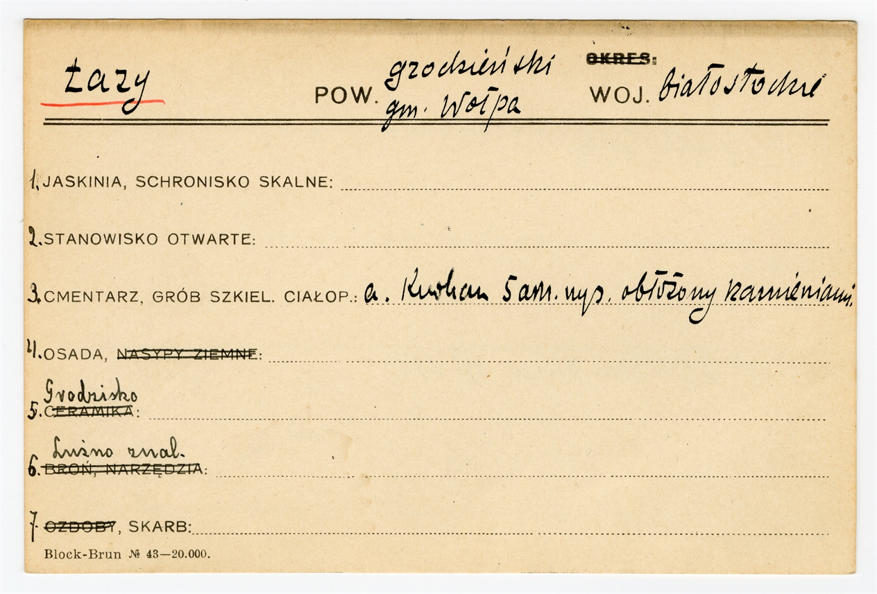 Karta stanowiska "Łazy gm. Wołpa pow. Grodzieński woj. białostockie" (druk rękopis) - strona 1