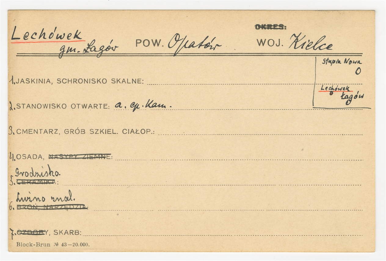 Karta stanowiska "Lechówek gm. Łagów pow. Opatów woj. Kielce" (druk rękopis) - strona 1