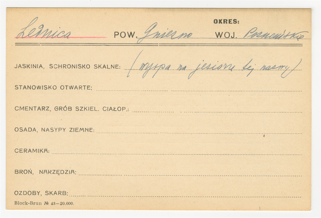 Karta stanowiska "Lednica pow. Gniezno woj. Poznańskie" (druk rękopis) - strona 1