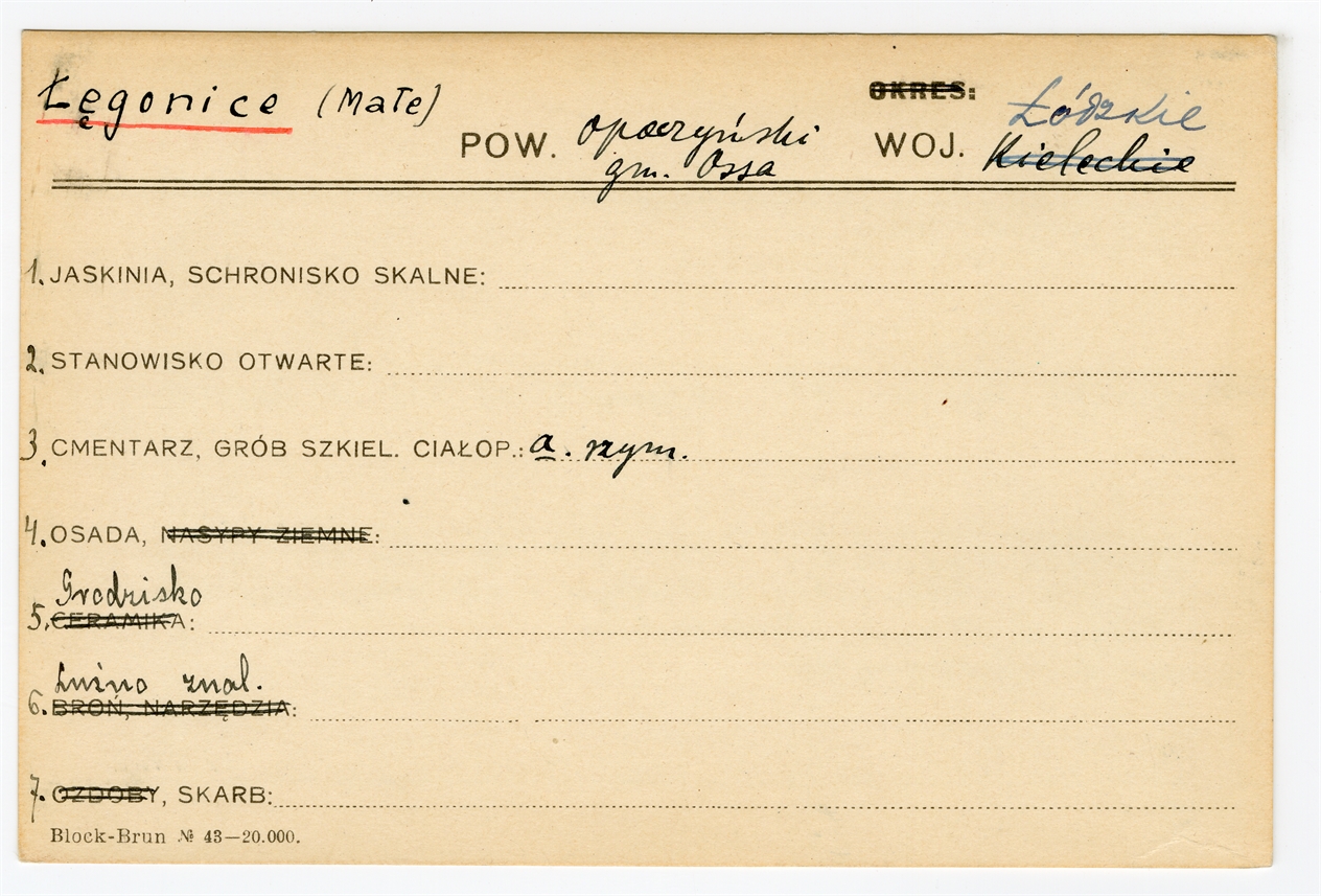 Karta stanowiska "Łęgonice (Małe) gm. Ossa pow. opoczyński woj. Łódzkie" (druk rękopis) - strona 1