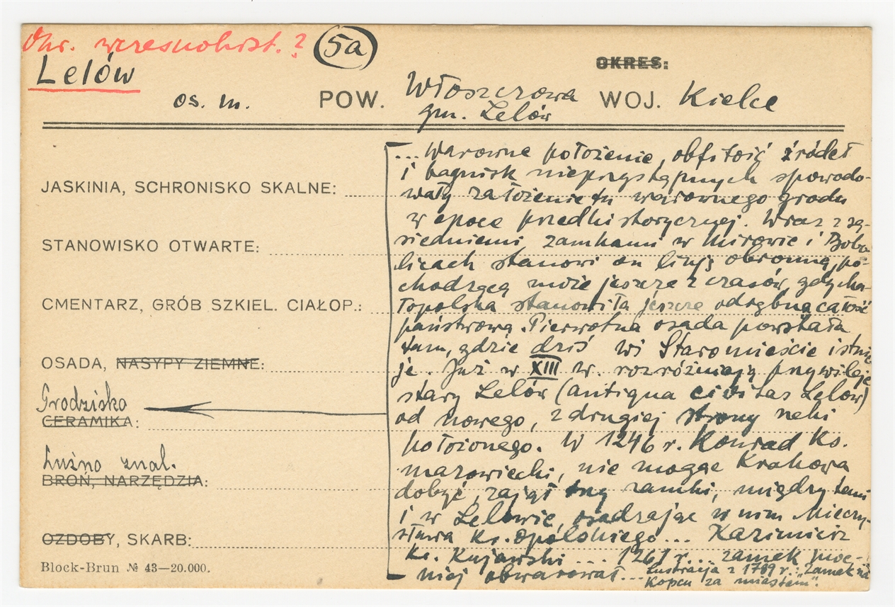 Karta stanowiska "Lelów gm. Lelów pow. Włoszczowa woj. kieleckie" (druk rękopis) - strona 1