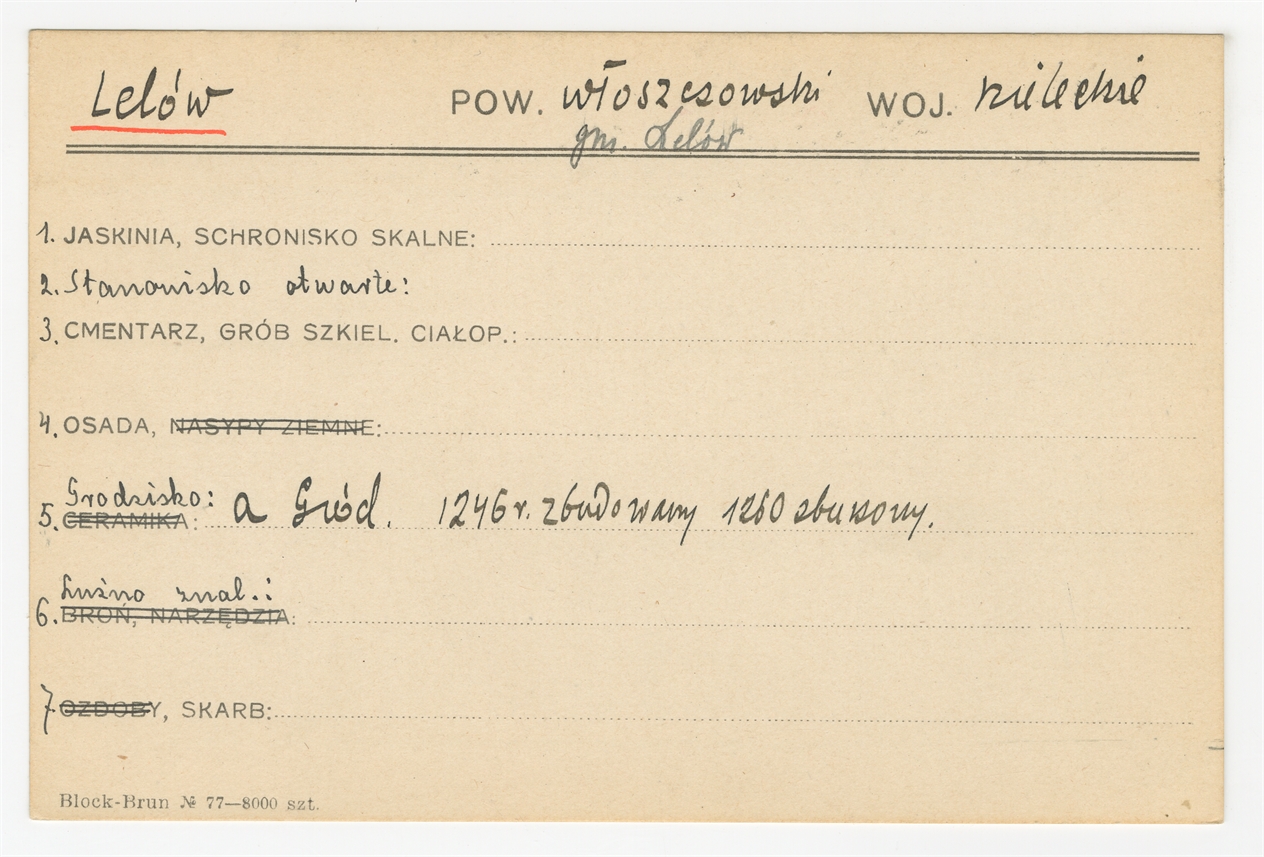 Karta stanowiska "Lelów gm. Lelów pow. włoszczowski woj. kieleckie" (druk rękopis) - strona 1