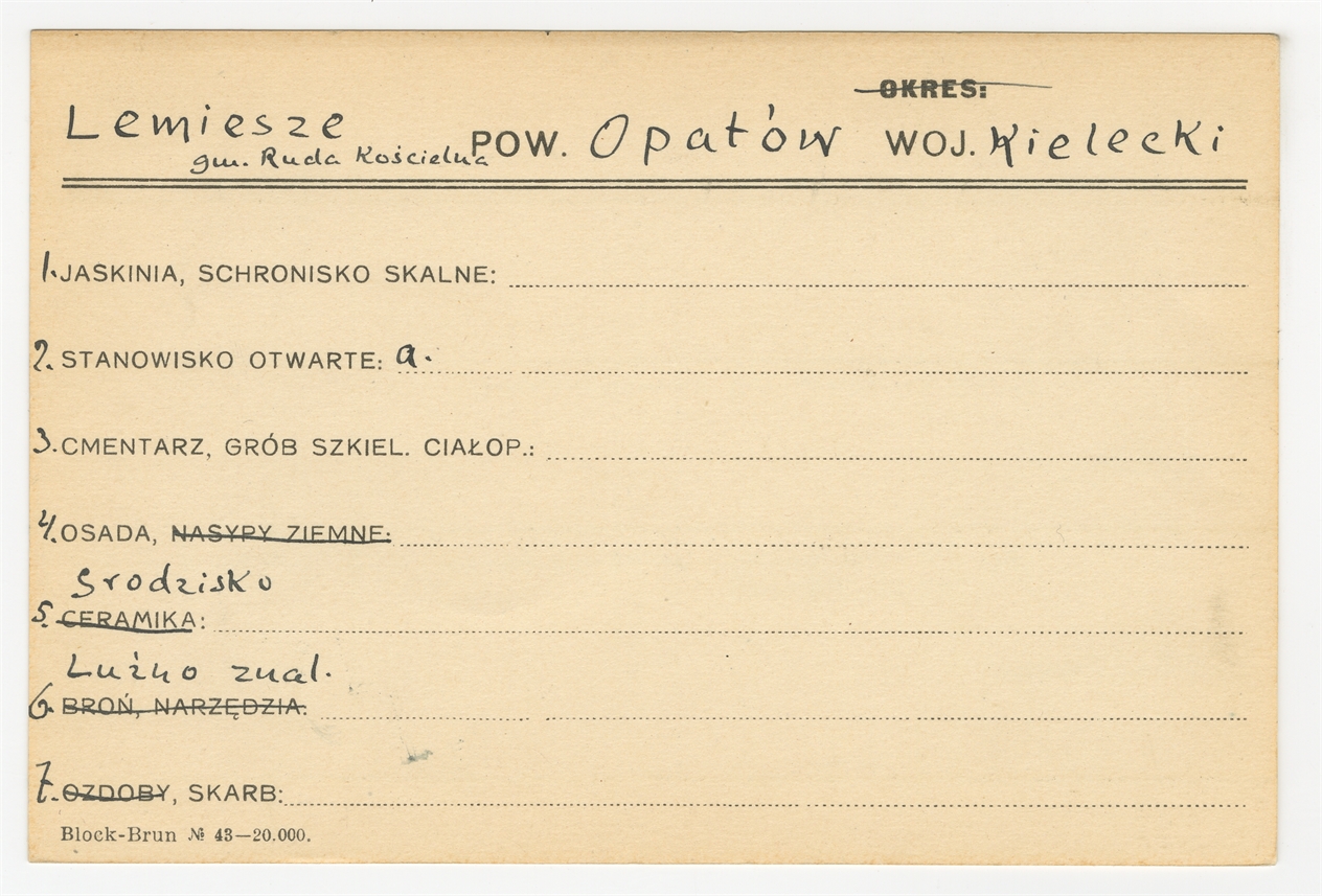Karta stanowiska "Lemiesze gm. Ruda Kościelna pow. Opatów woj. Kieleckie" (druk rękopis) - strona 1
