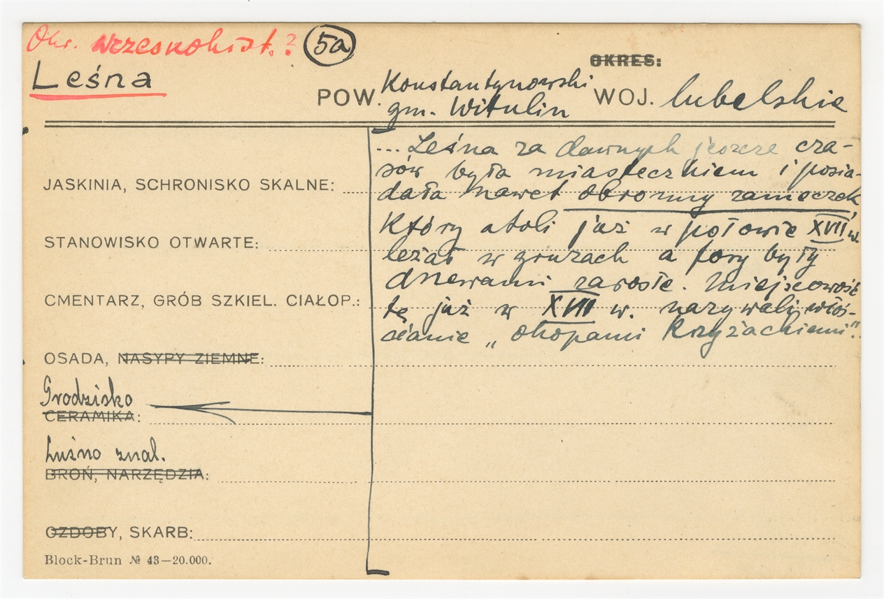 Karta stanowiska "Leśna gm. Witulin pow. Konstantynowski woj. lubelskie" (druk rękopis) - strona 1