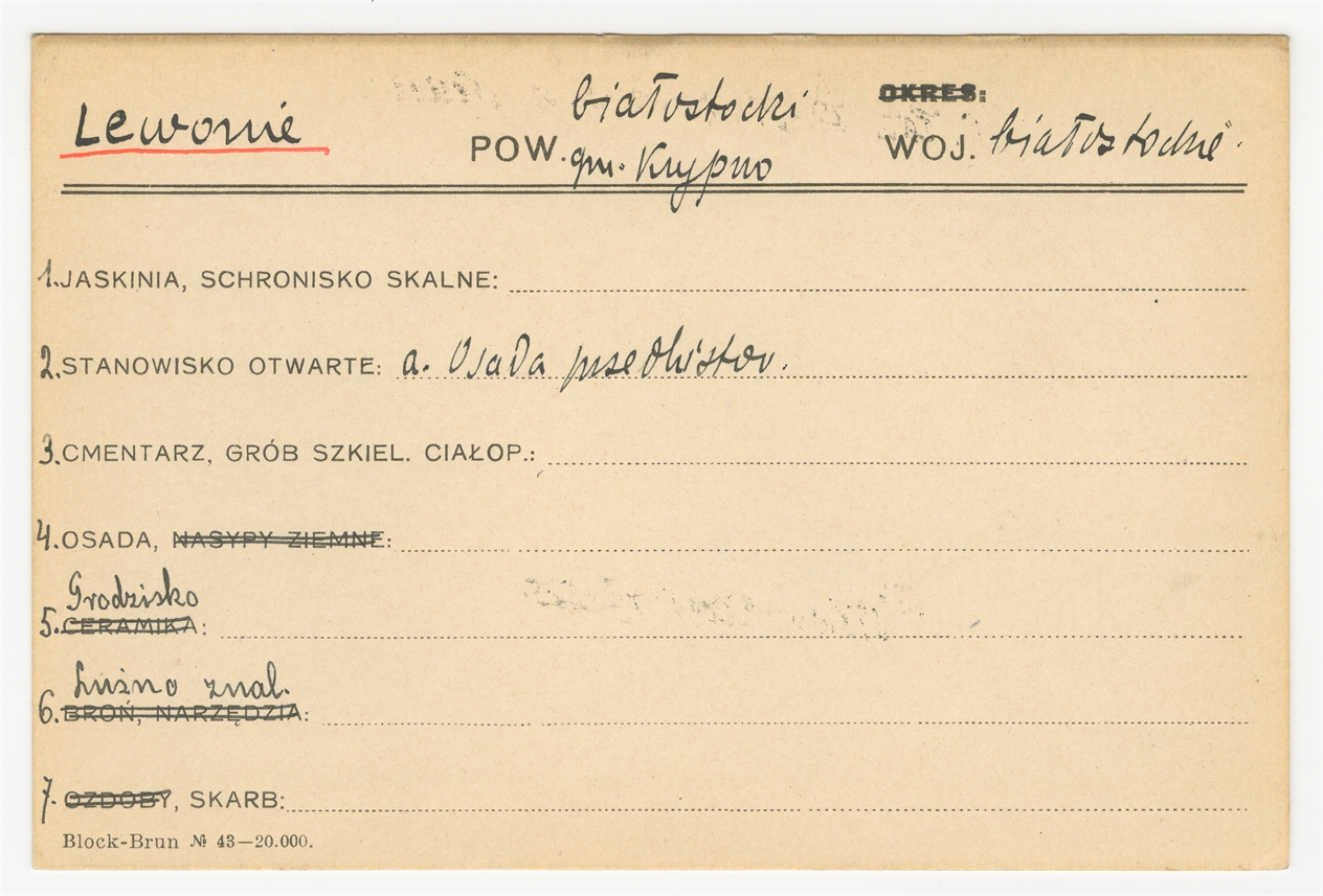 Karta stanowiska "Lewonie gm. Krypno pow. białostocki woj. białostockie" (druk rękopis) - strona 1