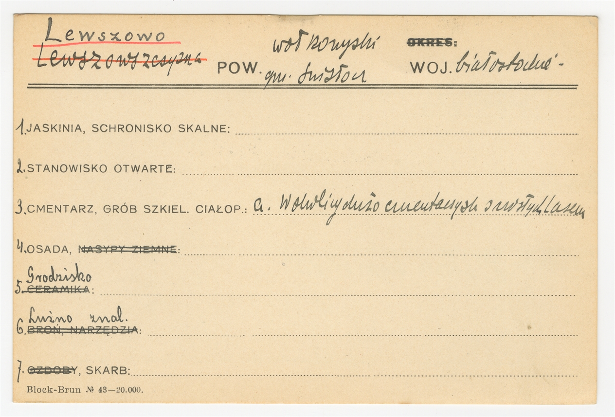 Karta stanowiska "Lewszowo gm. Świsłocz pow. wołkowyski woj. białostockie" (druk rękopis) - strona 1