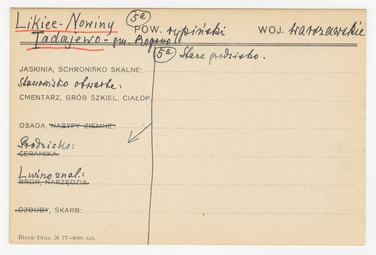 Karta stanowiska "Likiec-Nowiny Tadajewo gm. Rogowo pow. rypiński woj. warszawskie" (druk rękopis) - strona 1