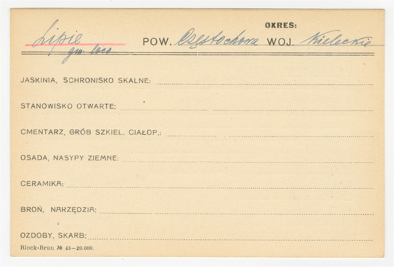 Karta stanowiska "Lipie gm. loco pow. Częstochowa woj. Kieleckie" (druk rękopis) - strona 1