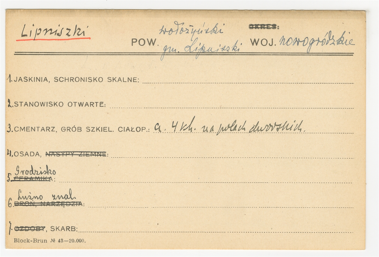 Karta stanowiska "Lipniszki gm. Lipniszki pow. wołożyński woj. nowogródzkie" (druk rękopis) - strona 1