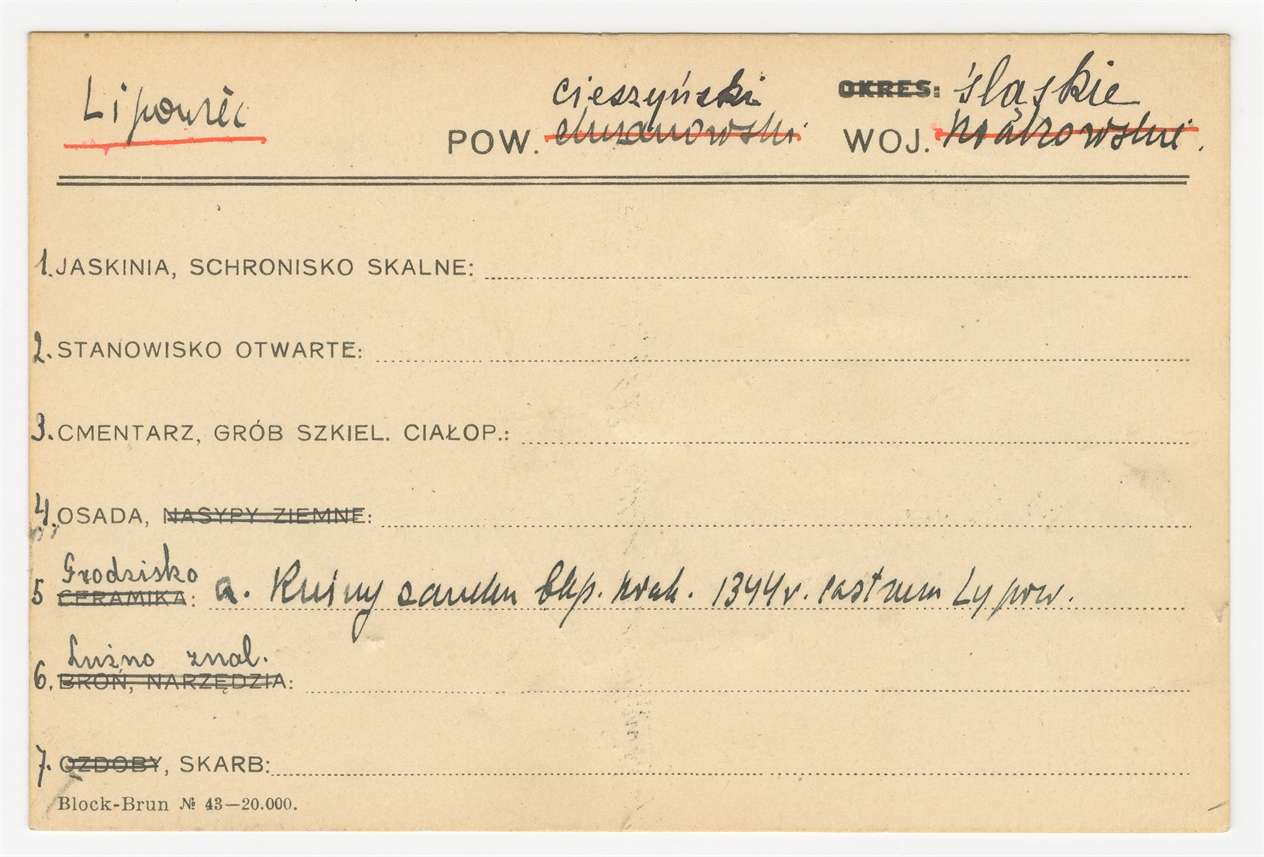 Karta stanowiska "Lipowiec pow. cieszyński woj. śląskie" (druk rękopis) - strona 1