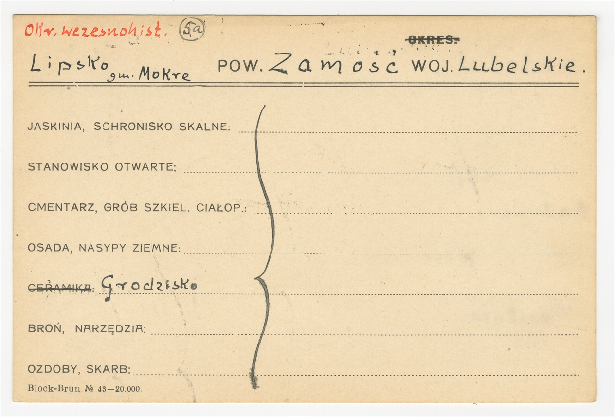 Karta stanowiska "Lipsko gm. Mokre pow. Zamość woj. Lubelskie" (druk rękopis) - strona 1