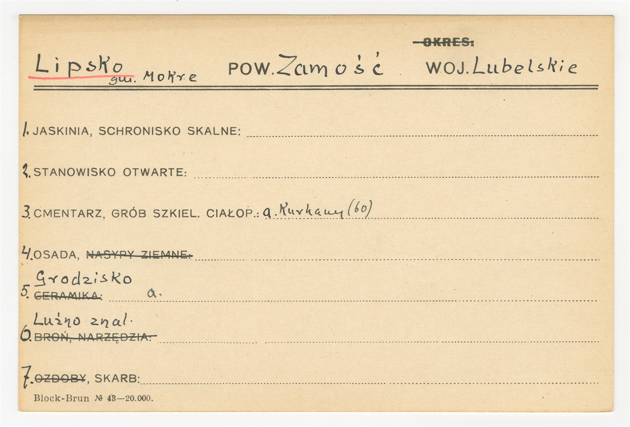 Karta stanowiska "Lipsko gm. Mokre pow. Zamość woj. Lubelskie" (druk rękopis) - strona 1