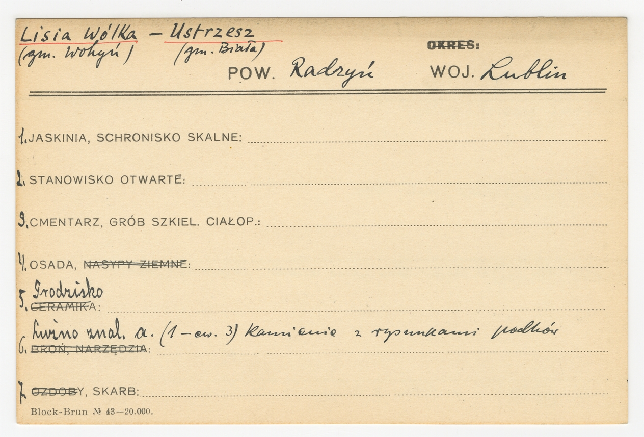 Karta stanowiska "Lisia Wólka - Ustrzesz gm. Wohyń Biała pow. Radzyń woj. Lublin" (druk rękopis) - strona 1
