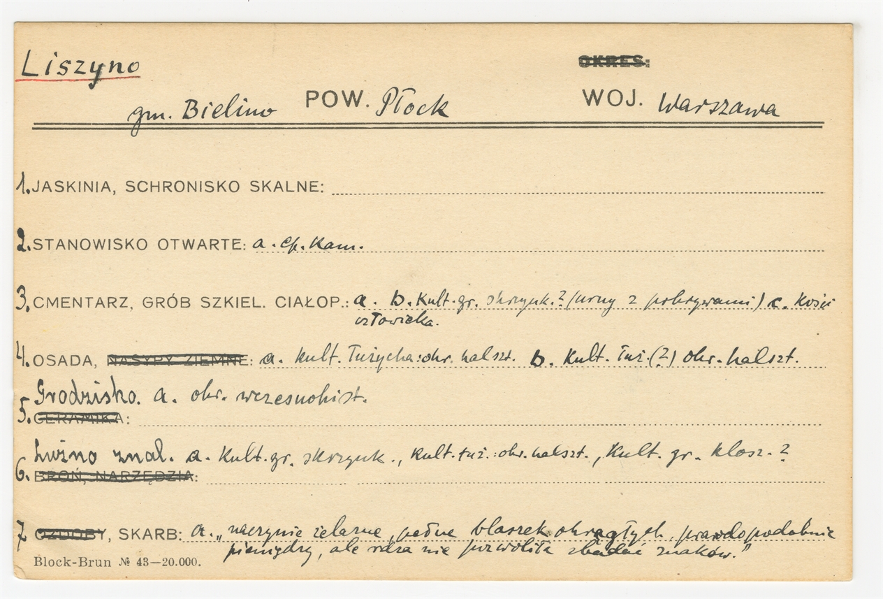 Karta stanowiska "Liszyno gm. Bielino pow. Płock woj. Warszawa" (druk rękopis) - strona 1