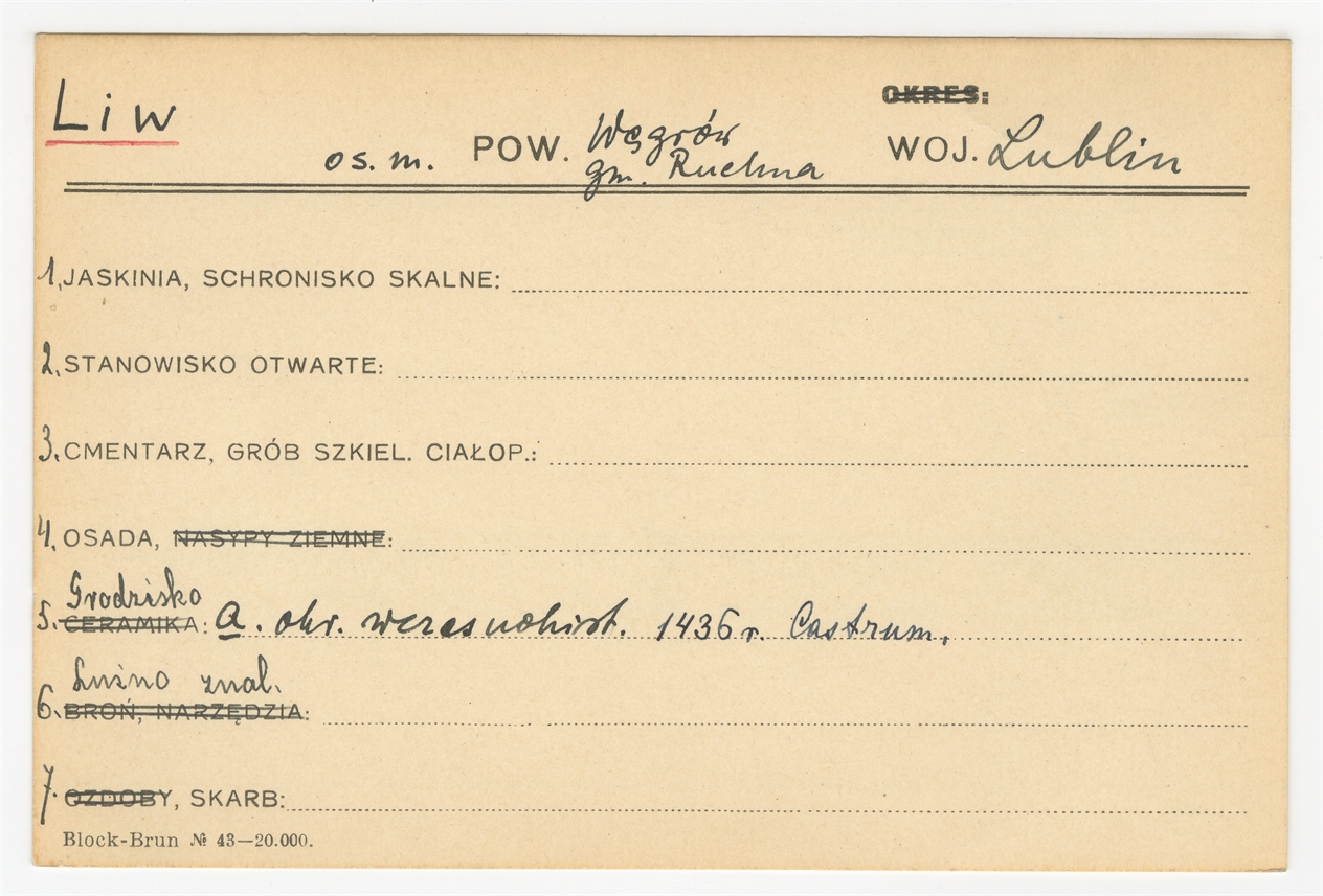 Karta stanowiska "Liw gm. Ruchna pow. Węgrów woj. Lublin" (druk rękopis) - strona 1