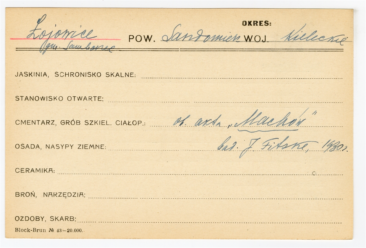 Karta stanowiska "Łojowice gm. Samborzec pow. Sandomierz woj. Kieleckie" (druk rękopis) - strona 1