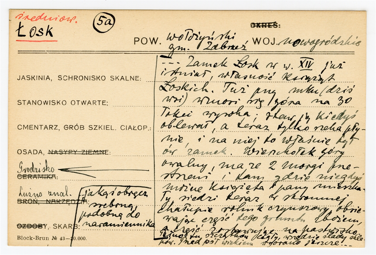 Karta stanowiska "Łosk gm. Zabrzeź pow. wołożyński woj. nowogródzkie" (druk rękopis) - strona 1