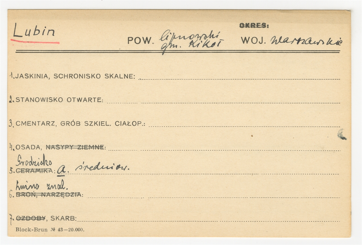 Karta stanowiska "Lubin gm. Kikoł pow. lipnowski woj. Warszawskie" (druk rękopis) - strona 1