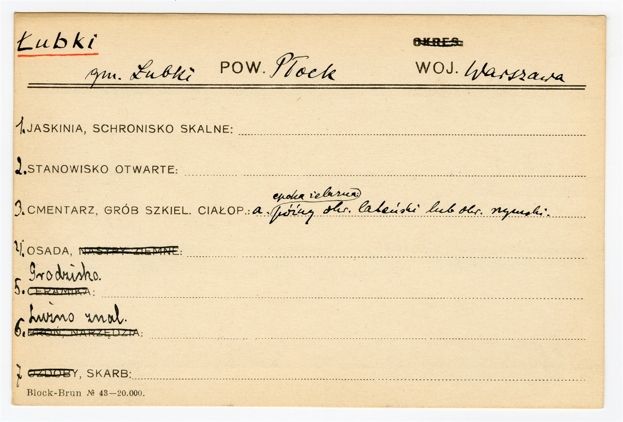 Karta stanowiska "Łubki gm. Łubki pow. Płock woj. Warszawa" (druk rękopis) - strona 1