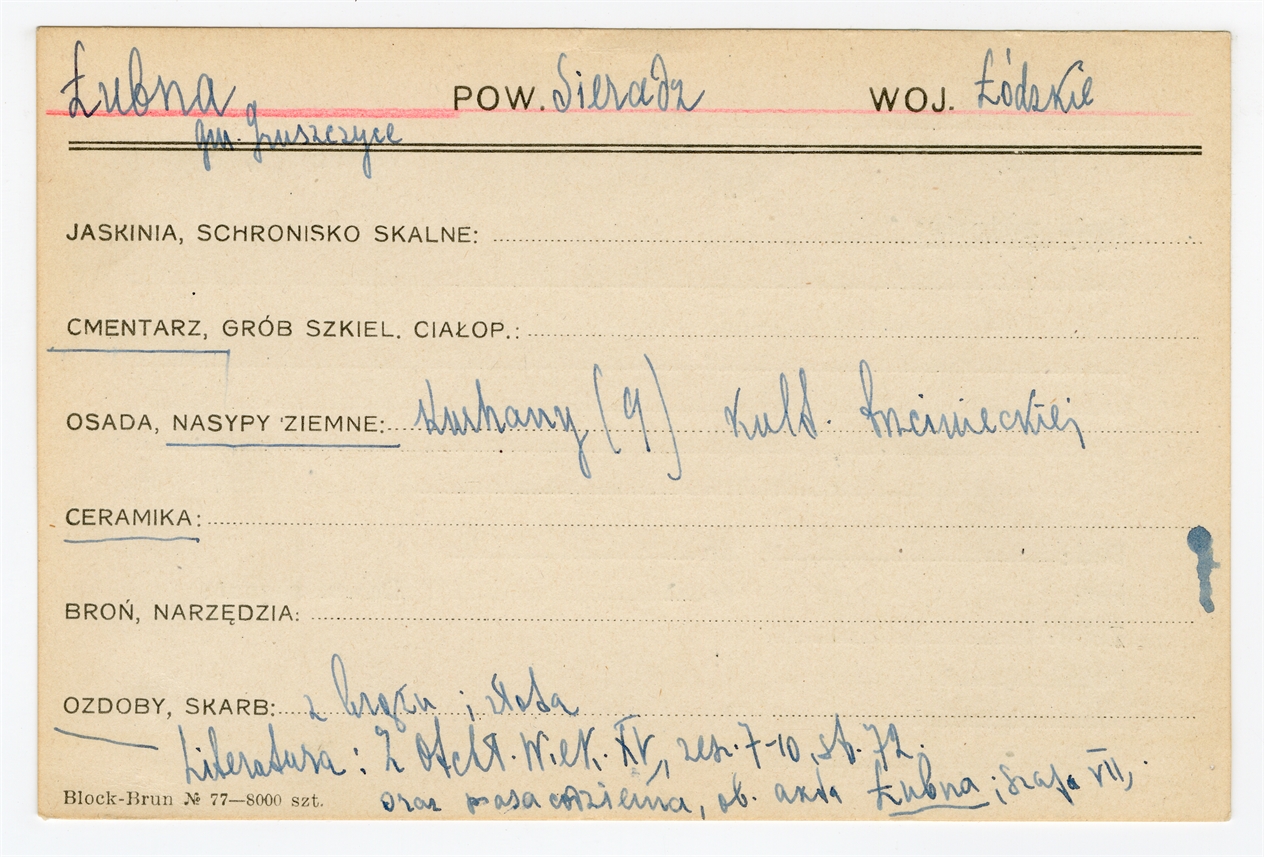 Karta stanowiska "Łubna gm. Guszczyce pow. Sieradz woj. Łódzkie" (druk rękopis) - strona 1