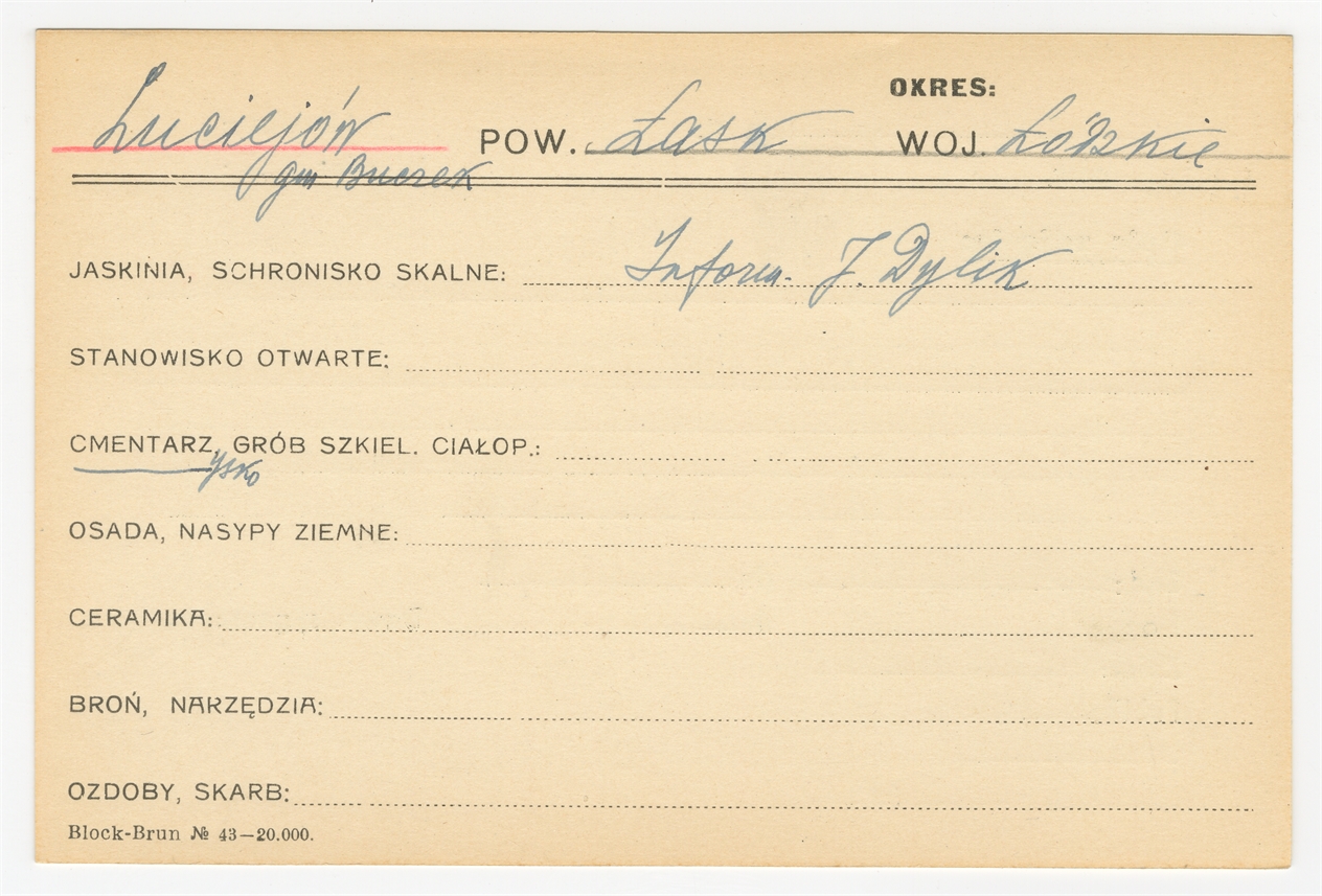 Karta stanowiska "Luciejów gm. Buczek pow. Łask woj. Łódzkie" (druk rękopis) - strona 1