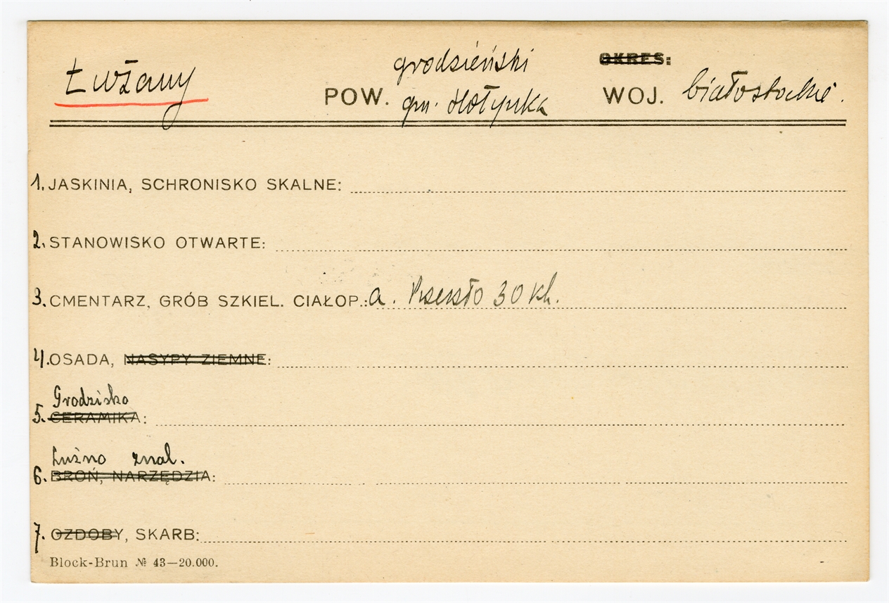 Karta stanowiska "Łużany gm. Hołynka pow. wołożyński woj. białostockie" (druk rękopis) - strona 1