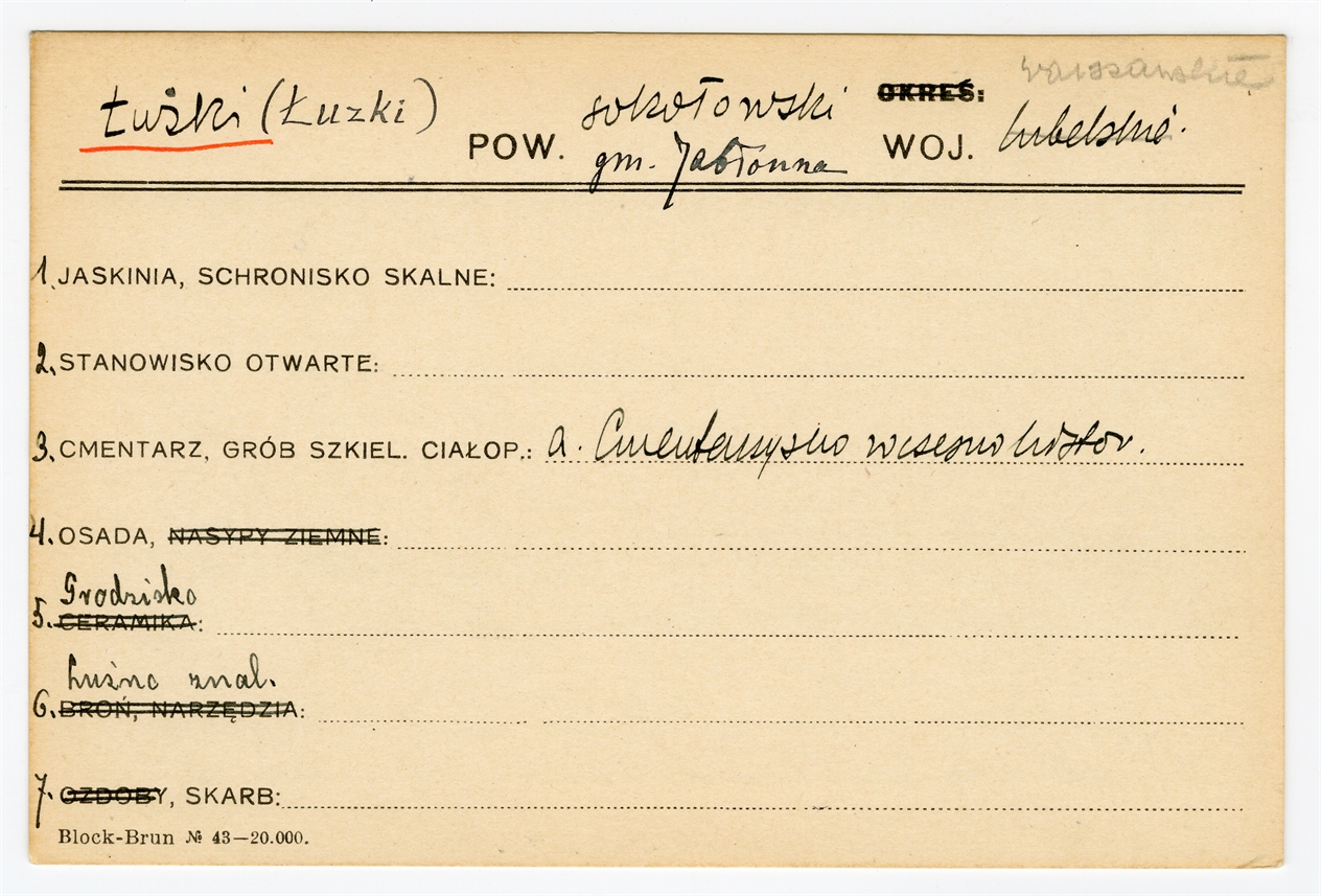 Karta stanowiska "Łużki (Łuzki) gm. Jabłonna pow. sokołowski woj. warszawskie" (druk rękopis) - strona 1