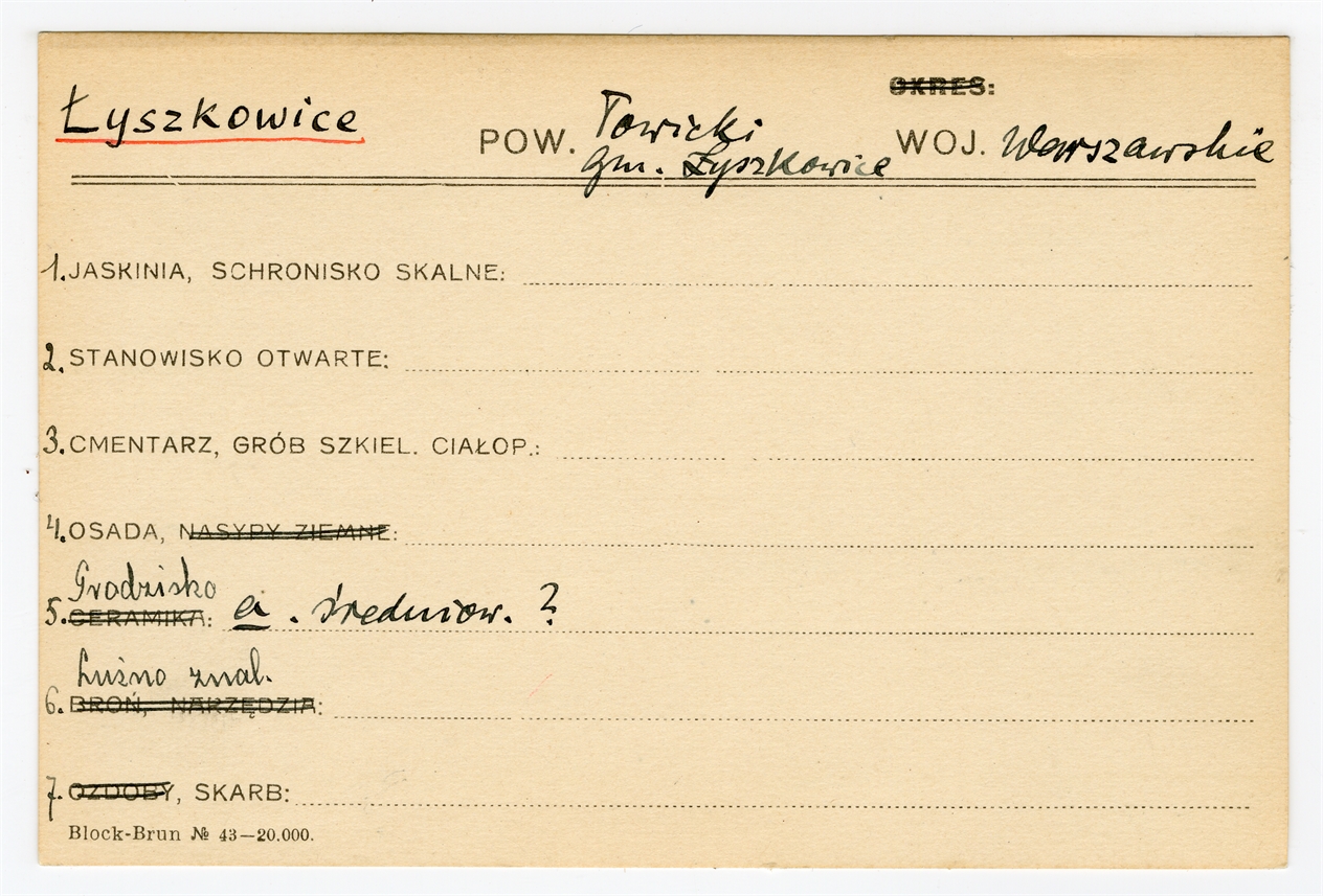 Karta stanowiska "Łyszkowice gm. Łyszkowice pow. łowicki woj. Warszawskie" (druk rękopis) - strona 1