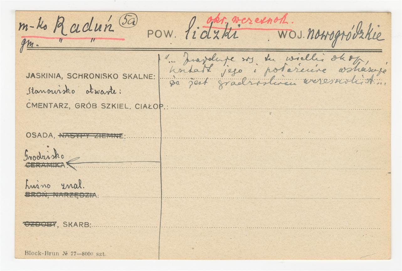 Karta stanowiska "m-ko Raduń pow. Lidzki woj. nowogródzkie" (druk rękopis) - strona 1