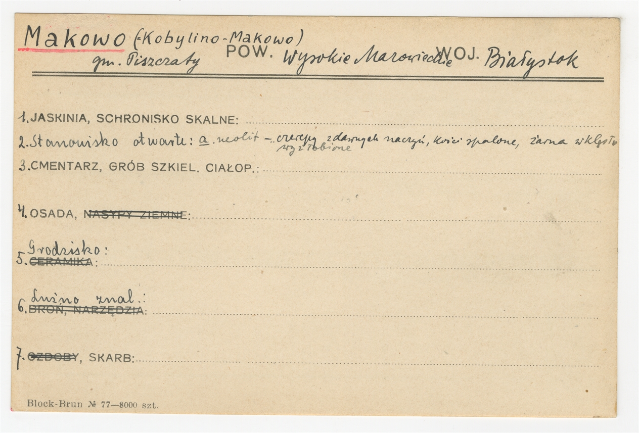 Karta stanowiska "Makowo (=Kobylino-Makowo) gm. Piszczaty pow. Wysokie Mazowieckie woj. Białystok" (druk rękopis) - strona 1