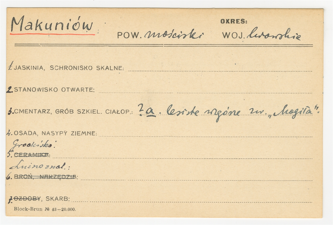 Karta stanowiska "Makuniów pow. Mościski woj. lwowskie" (druk rękopis) - strona 1