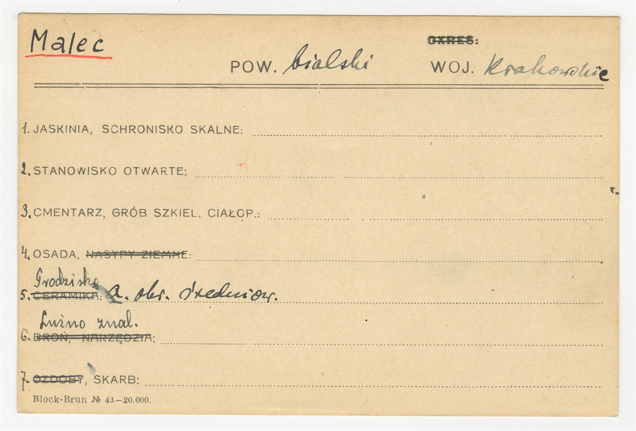 Karta stanowiska "Malec pow. bialski woj. Krakowskie" (druk rękopis) - strona 1