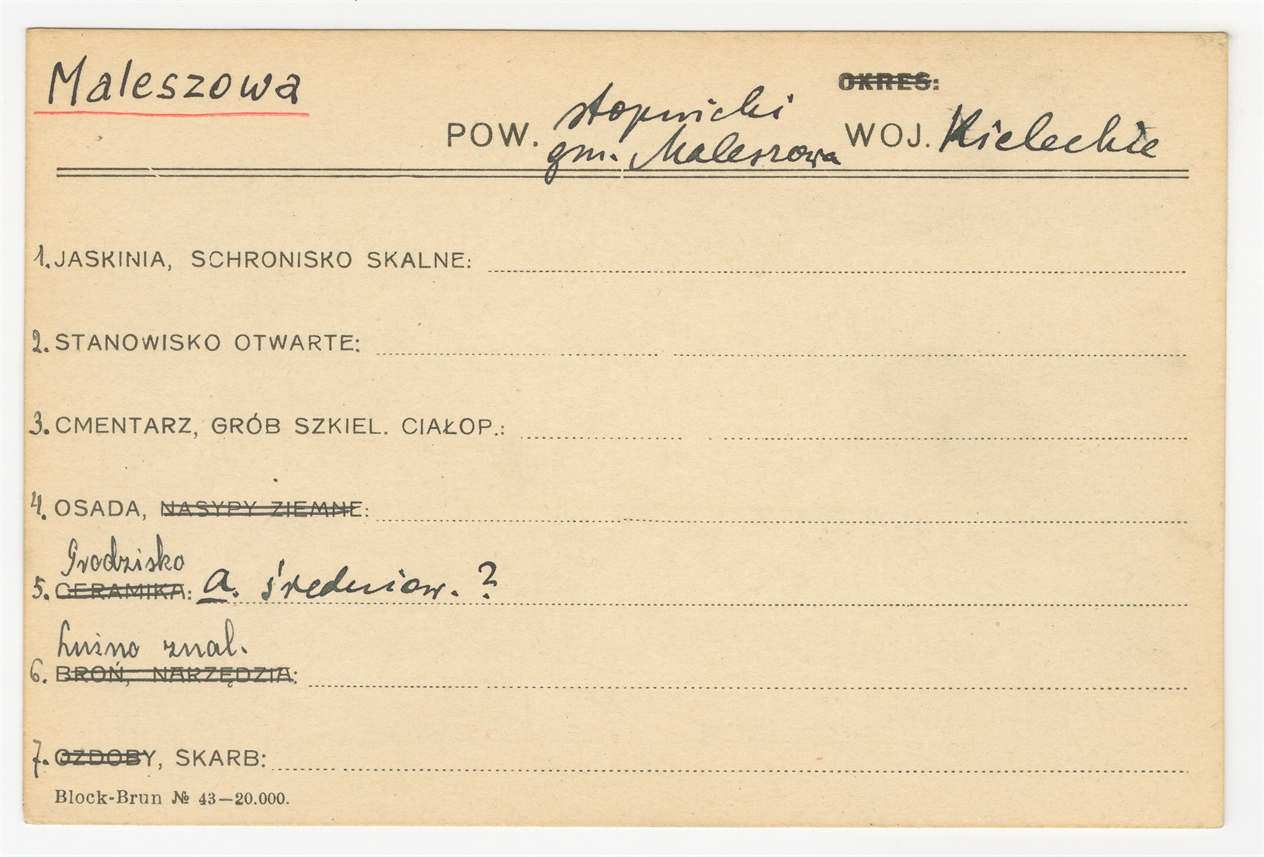 Karta stanowiska "Maleszowa gm. Maleszowa pow. stopnicki woj. Kieleckie" (druk rękopis) - strona 1
