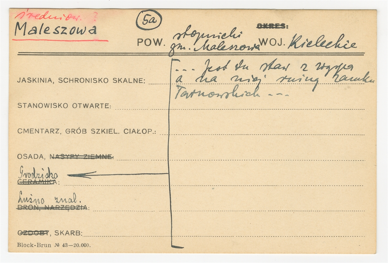 Karta stanowiska "Maleszowa gm. Maleszowa pow. stopnicki woj. Kieleckie" (druk rękopis) - strona 1