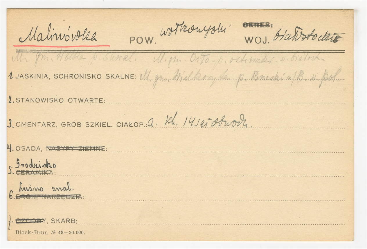 Element 1 - Karta stanowiska "Malinówka pow. wołkowyski woj. białostockie" (druk rękopis) - strona 1