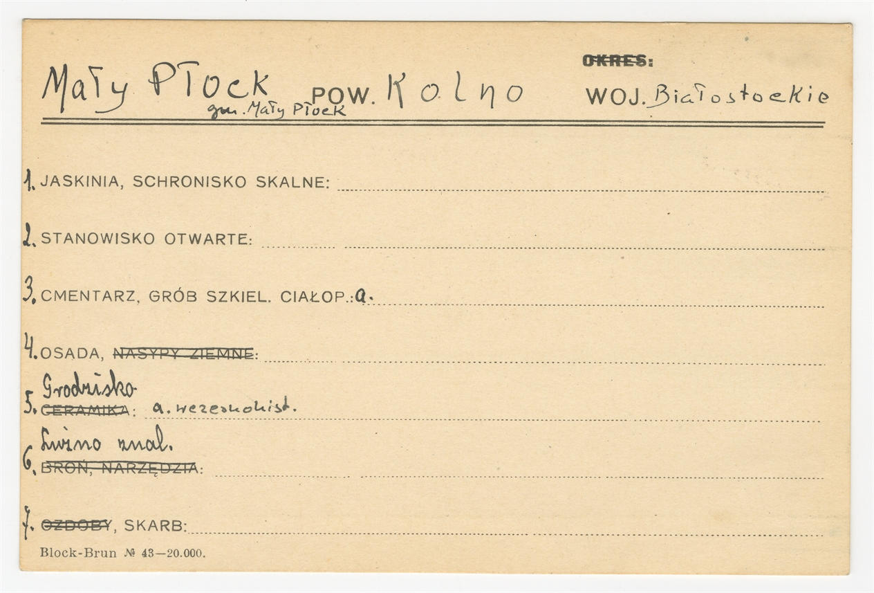 Karta stanowiska "Mały Płock gm. Mały Płock pow. Kolno woj. Białostockie" (druk rękopis) - strona 1