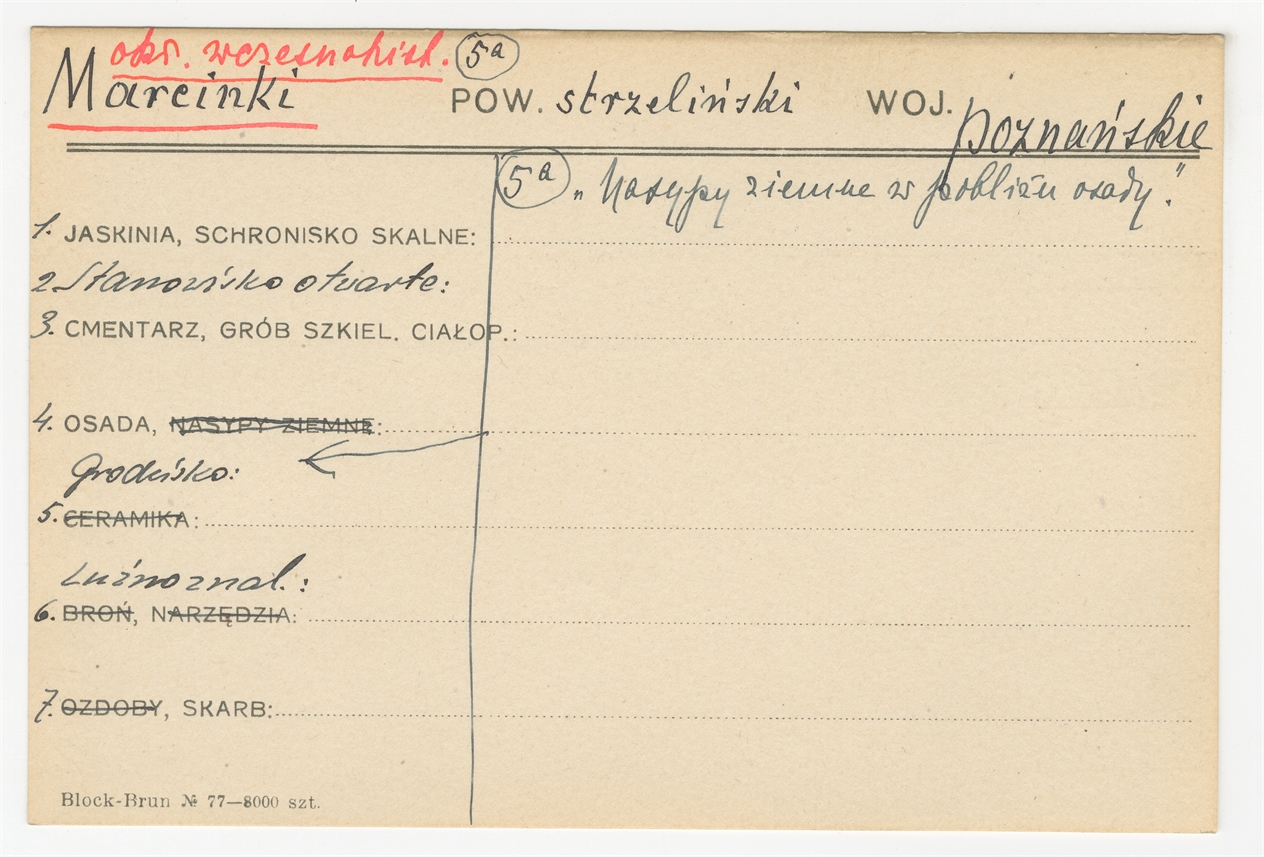 Karta stanowiska "Marcinki pow. strzeliński woj. poznańskie" (druk rękopis) - strona 1