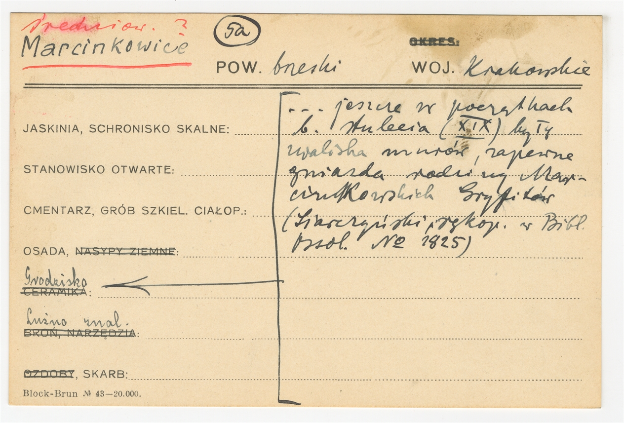 Karta stanowiska "Marcinkowice pow. brzeski woj. Krakowskie" (druk rękopis) - strona 1