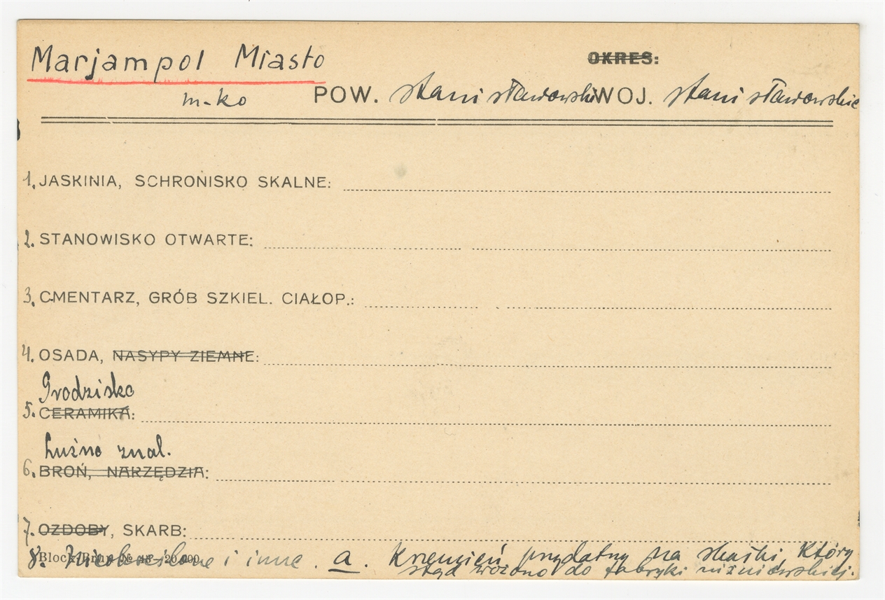Karta stanowiska "Marjampol Miasto pow. stanisławowski woj. stanisławowskie" (druk rękopis) - strona 1