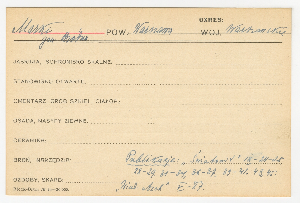 Karta stanowiska "Marki gm. Bródno pow. Warszawa woj. Warszawskie" (druk rękopis) - strona 1