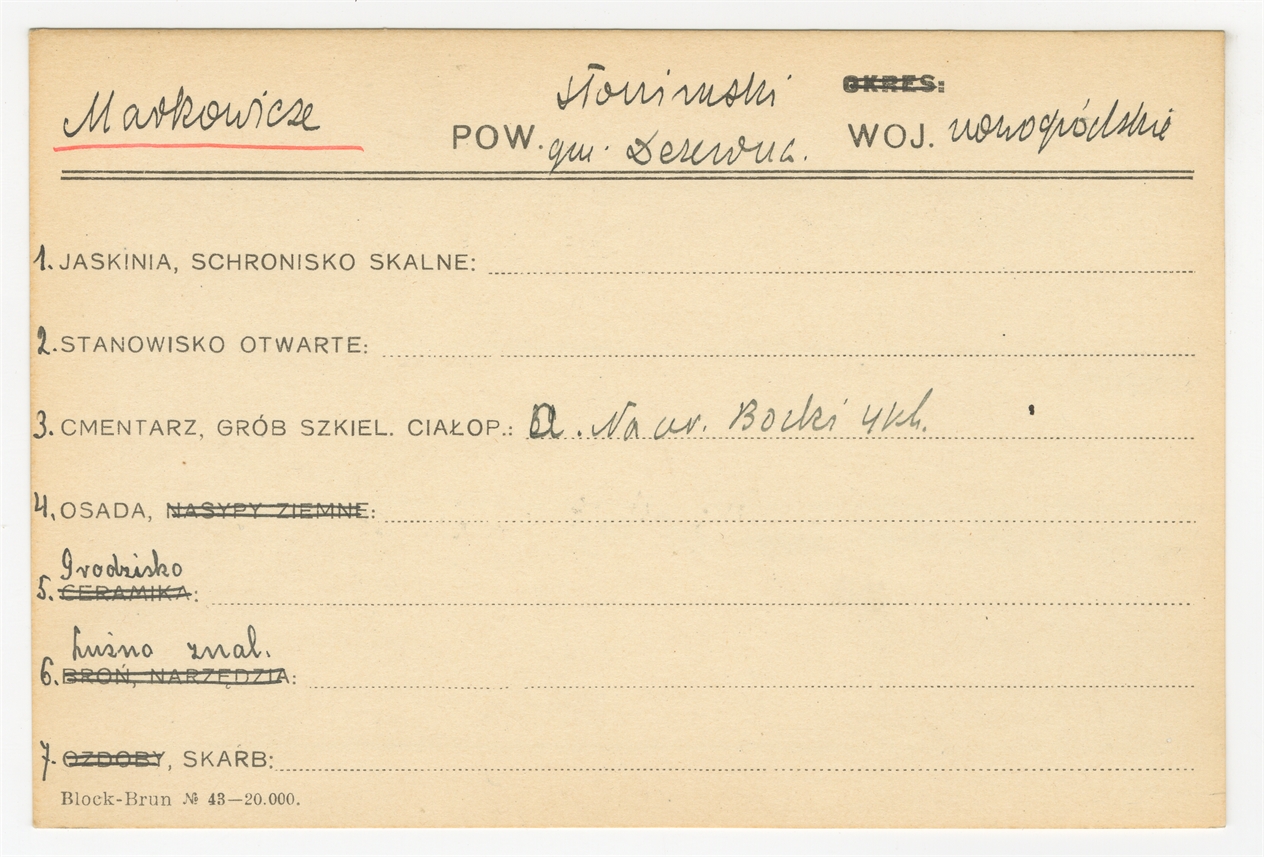 Karta stanowiska "Markowicze gm. Derewna pow. słonimski woj. nowogródzkie" (druk rękopis) - strona 1