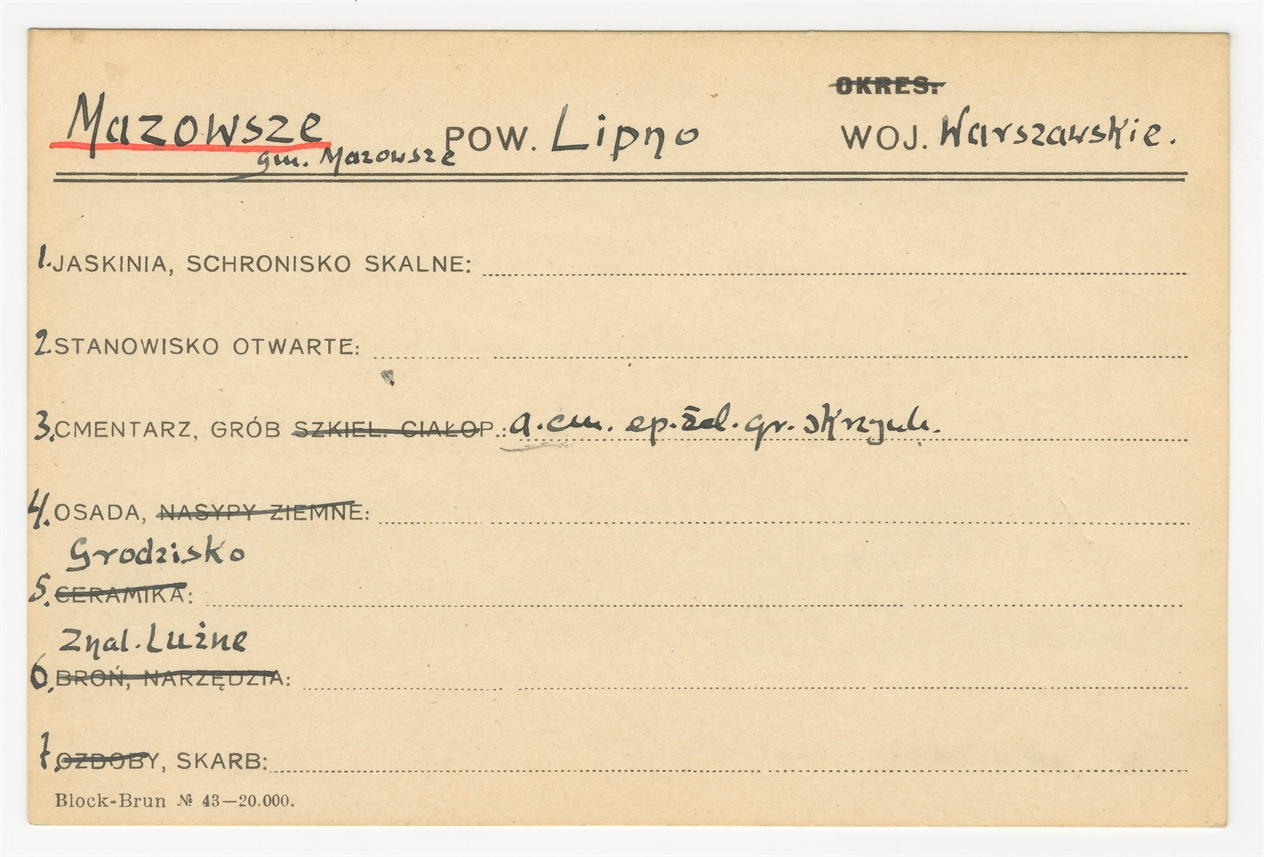 Karta stanowiska "Mazowsze gm. Mazowsze pow. Lipno woj. Warszawskie" (druk rękopis) - strona 1