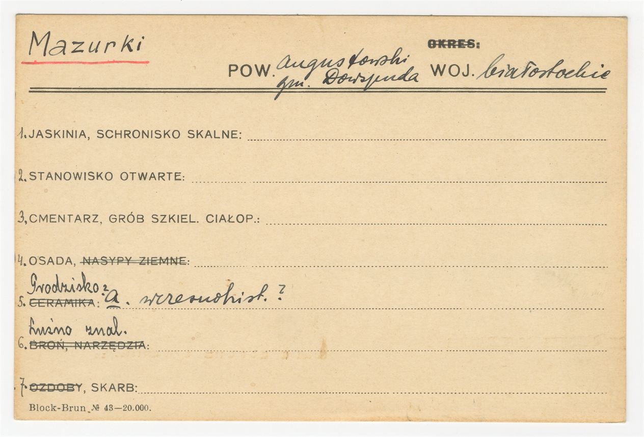 Karta stanowiska "Mazurki gm. Dowspuda pow. augustowski woj. białosotckie" (druk rękopis) - strona 1